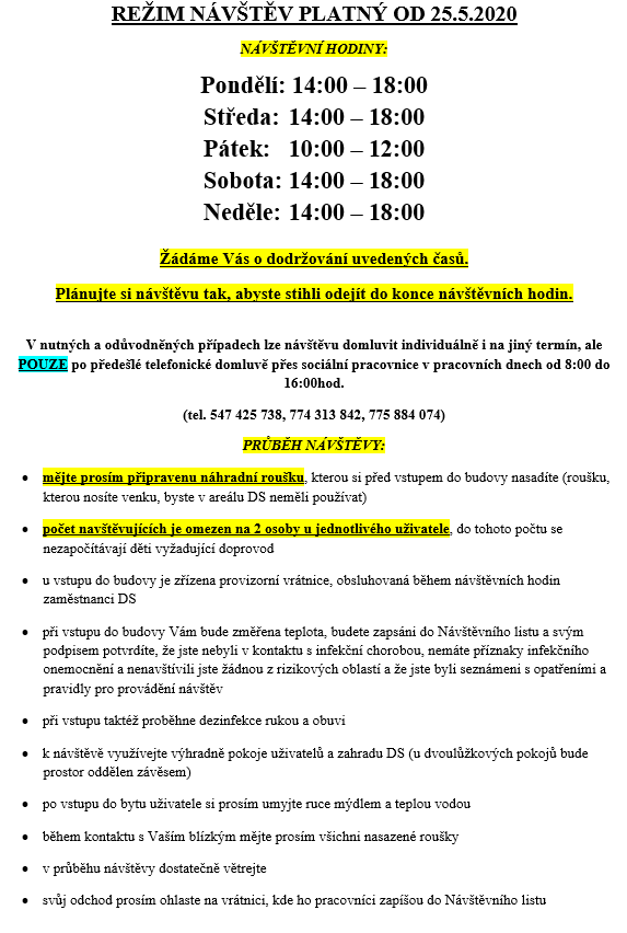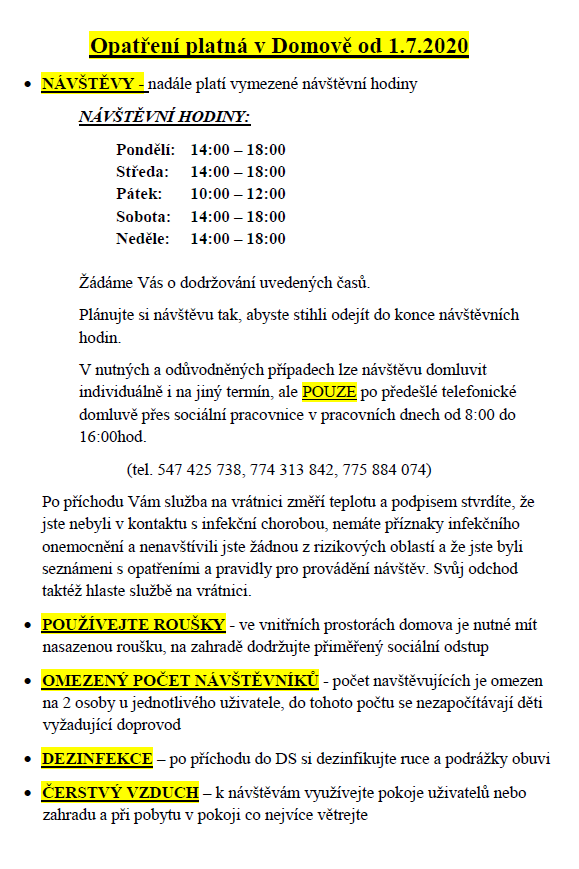 Situace kolem epidemie koronaviru se postupně uklidňuje a dochází ke zmírňování nebo úplnému zrušení dříve zavedených opatření. Určitě jste všichni zaznamenali změny, které jsou od 1. července platné a možná Vám neuniklo, že jsou mezi výjimkami v uvolnění zmiňovány krom zdravotnických zařízení také zařízení sociálních služeb.