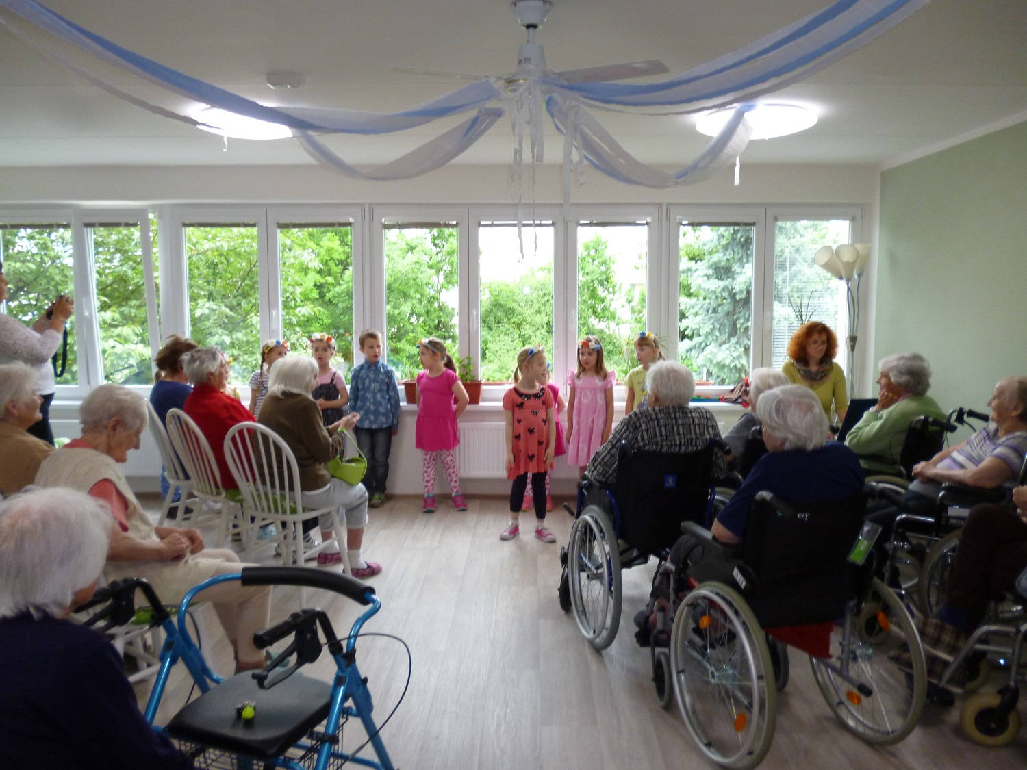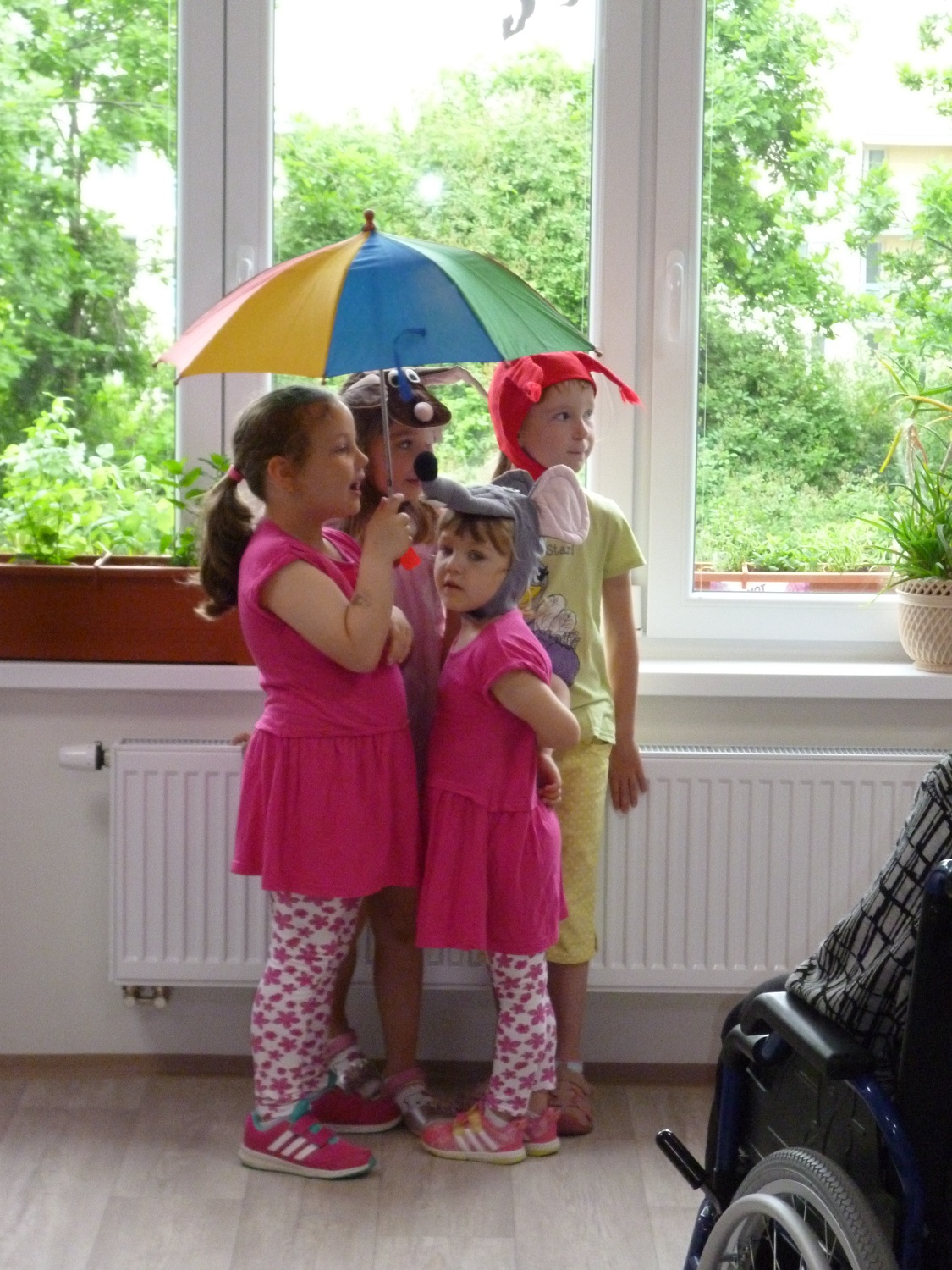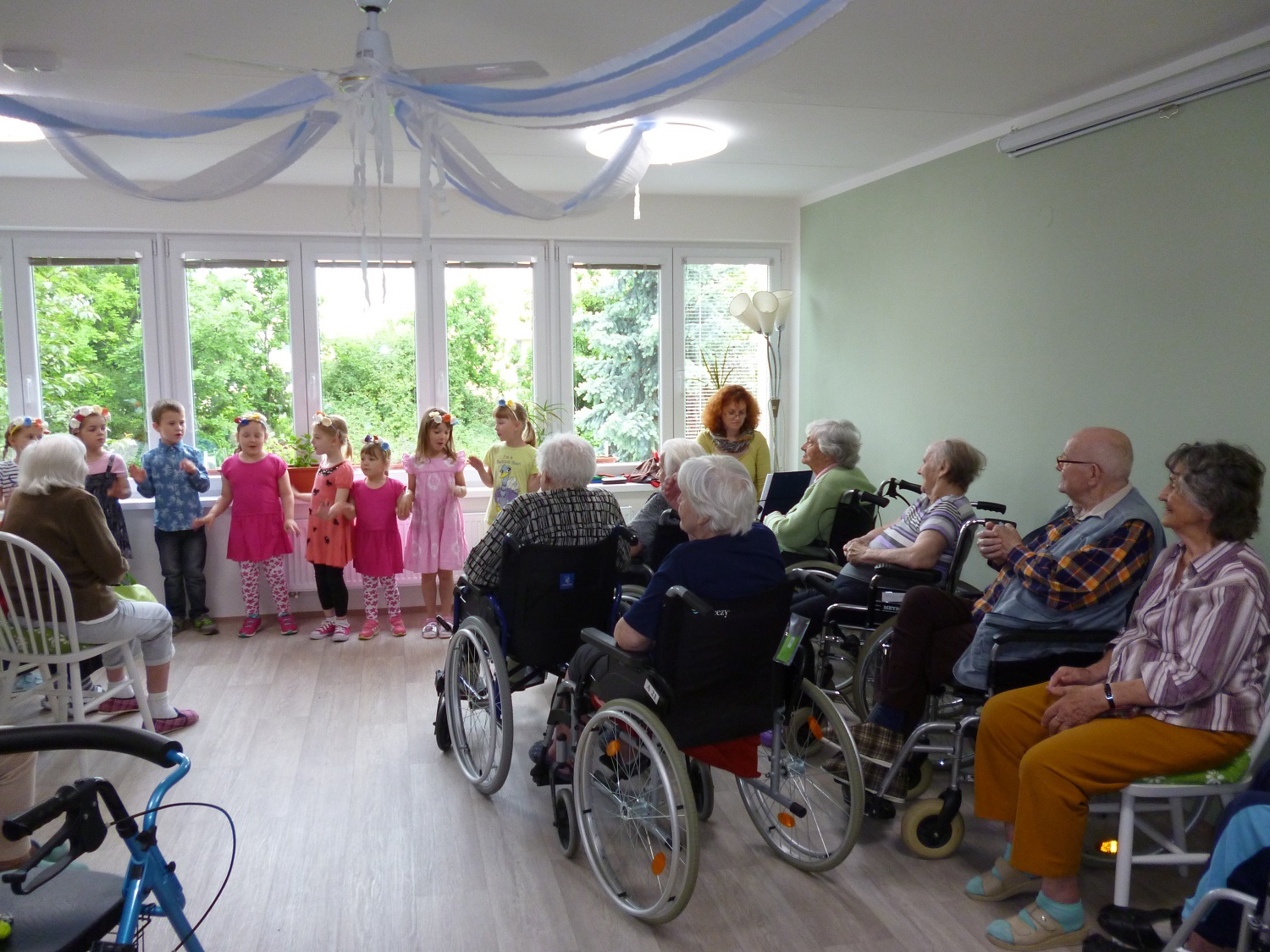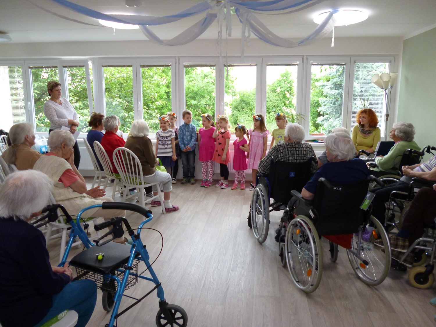 Zahrada už se nám zazelenala, všecko kvete a to je ta pravá doba, kdy k nám chodí děti z MŠ Pomněnka, aby nám předvedli, co se naučili od Vánoc nového.