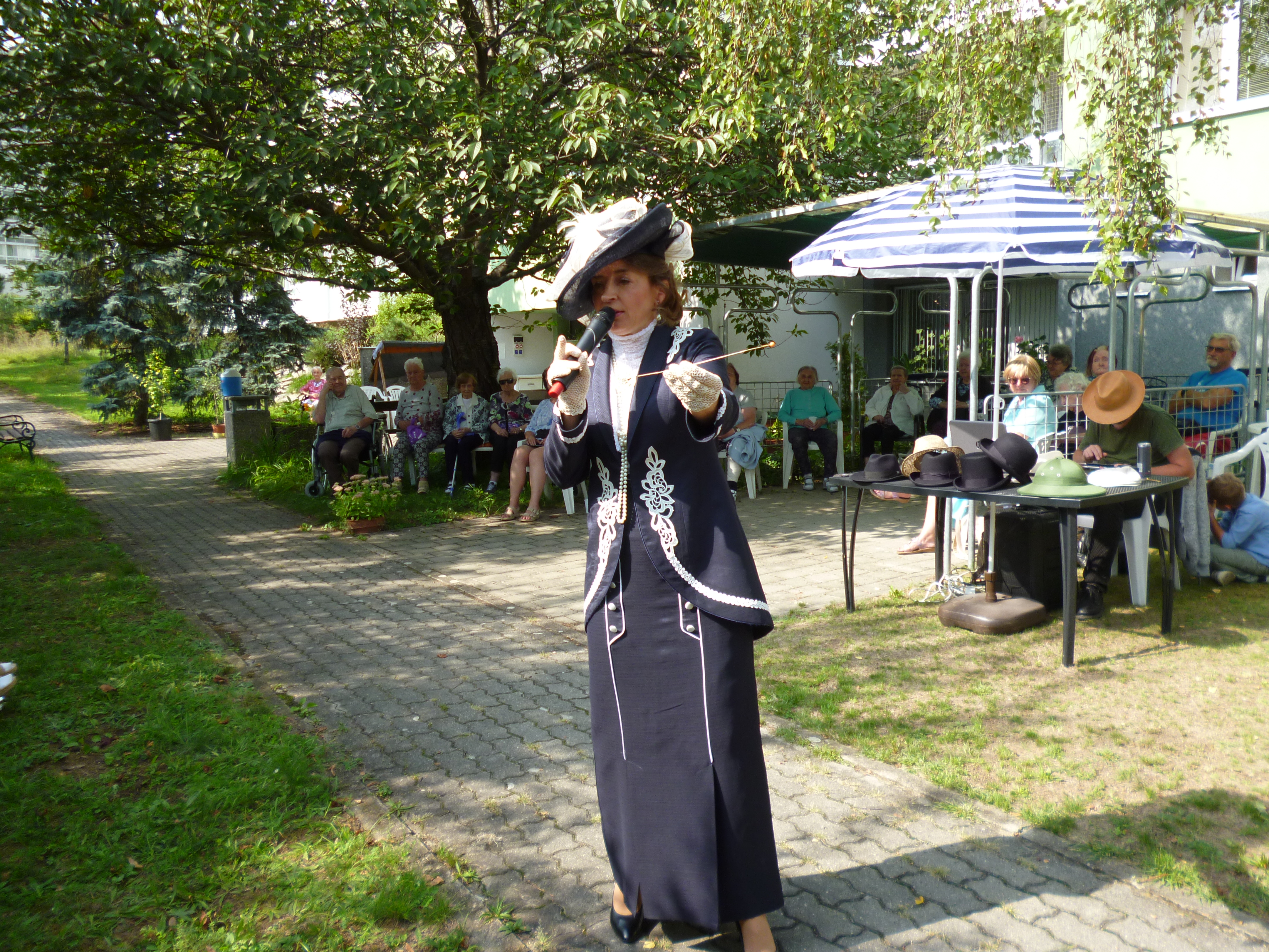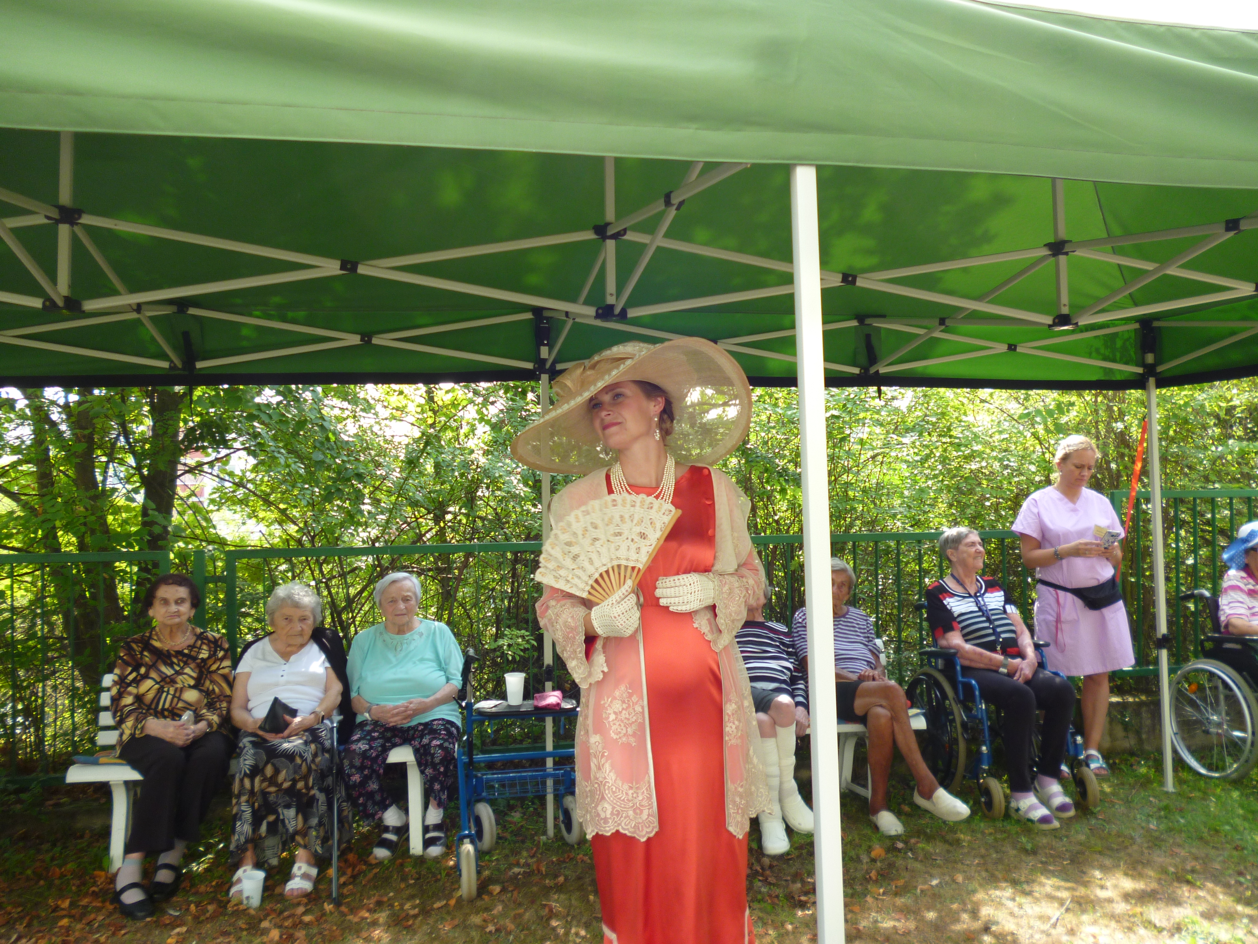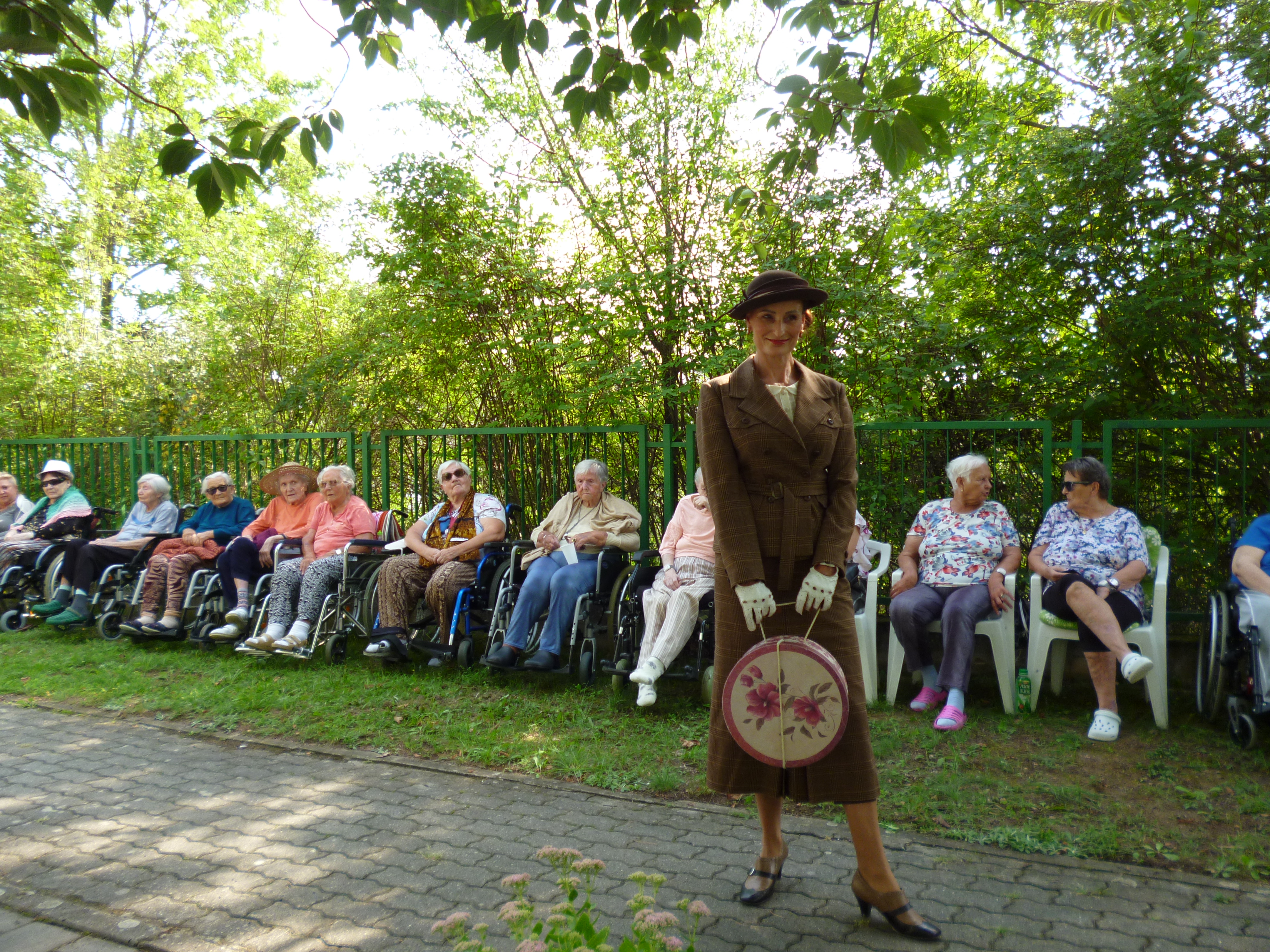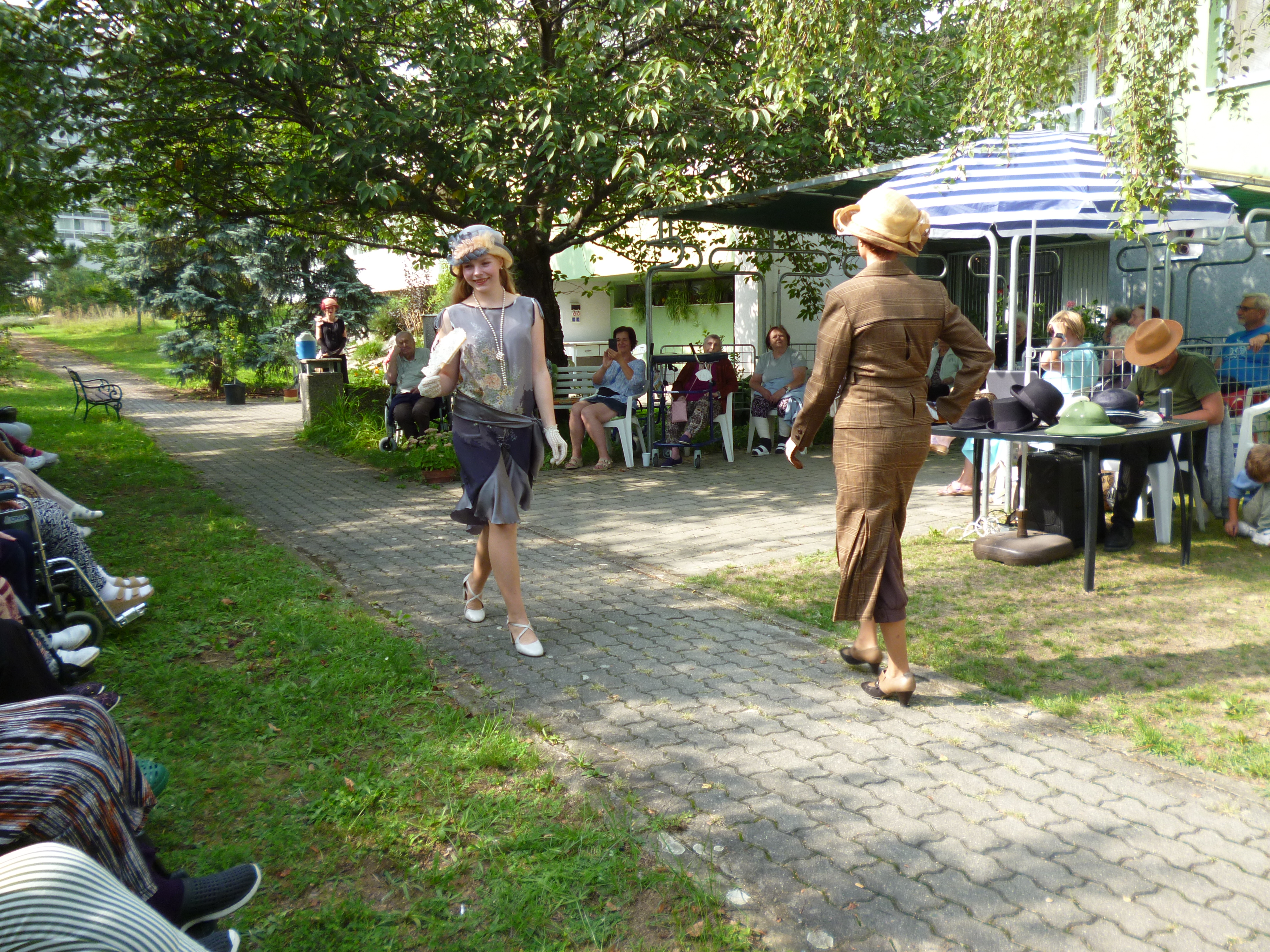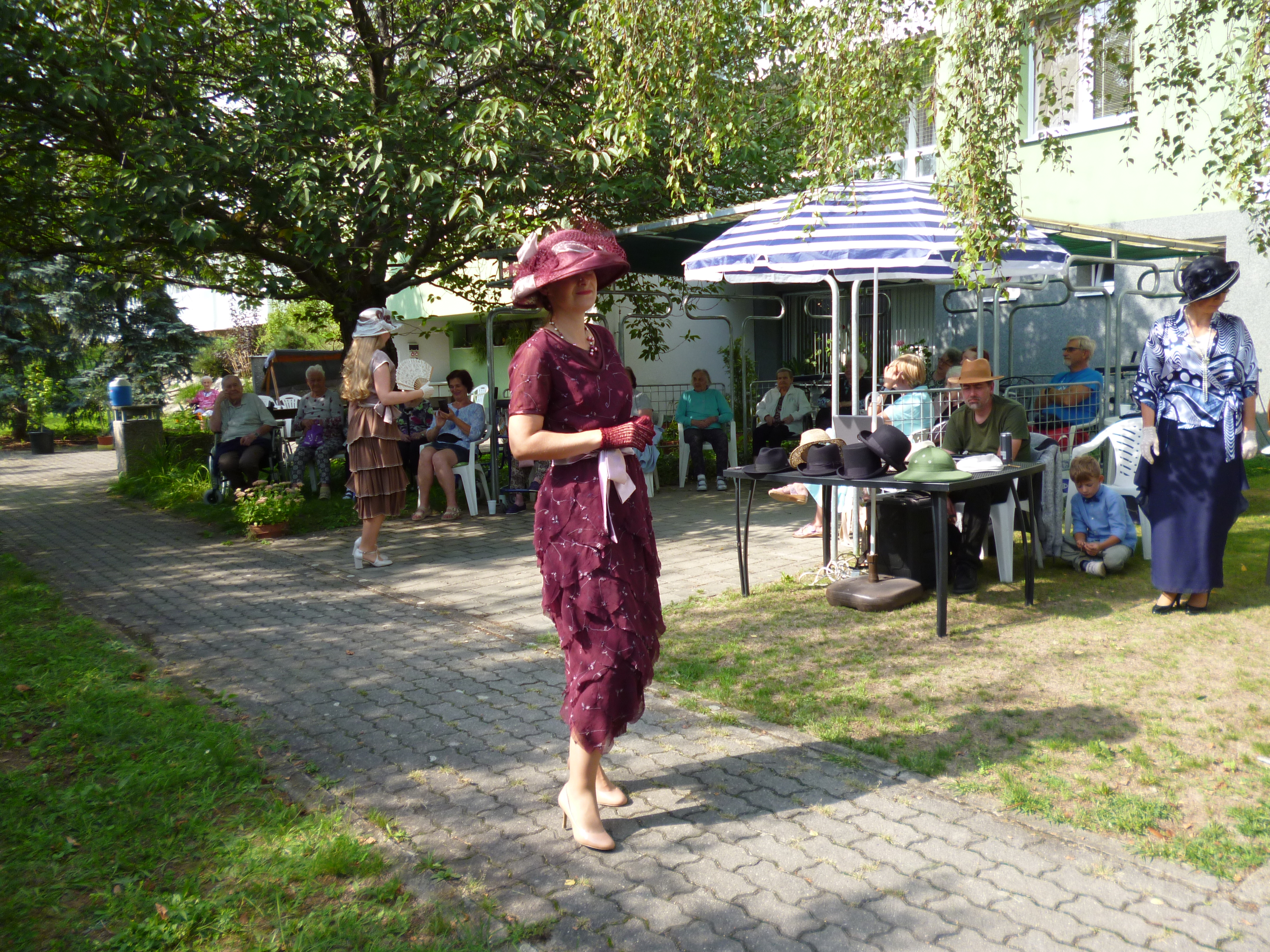 Letní odpoledne v zahradě domova ovládla noblesa, krása a elegance. Navštívil nás Kloboukový klub. Manekýnky s paní majitelkou Radkou Chabičovskou se postaraly opět o výjimečný zážitek. Krásné šaty a především klobouky se lehce vznášely po zahradě jako pestrobarevní motýli. Manekýnky vynášely modely z různých časových období a paní Radka velice poutavě provázela přehlídku zajímavými informacemi z jednotlivých historických období. Některé naše uživatelky se rozpomínaly na dobu, kdy byly mladé a tyto modely a klobouky se běžně nosily. Děkujeme Kloboukovému klubu za krásné odpoledne.