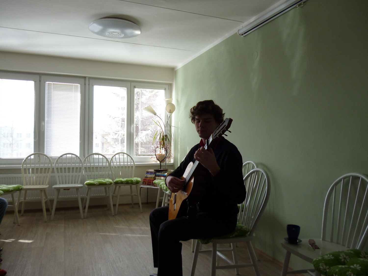 Jsme rádi, že naše pozvání přijal mladý nadějný kytarista Vít Dvořáček. Absolvent konzervatoře momentálně studuje kytaru na AMU v Praze. Společně jsme se ponořili do různých hudebních skladeb z historicky zajímavých období, dozvěděli jsme se něco zajímavého o tomto populárním nástroji. A na závěr jsme si společně zazpívali několik tzv. populárních písní. Byl to velice příjemně strávený čas.