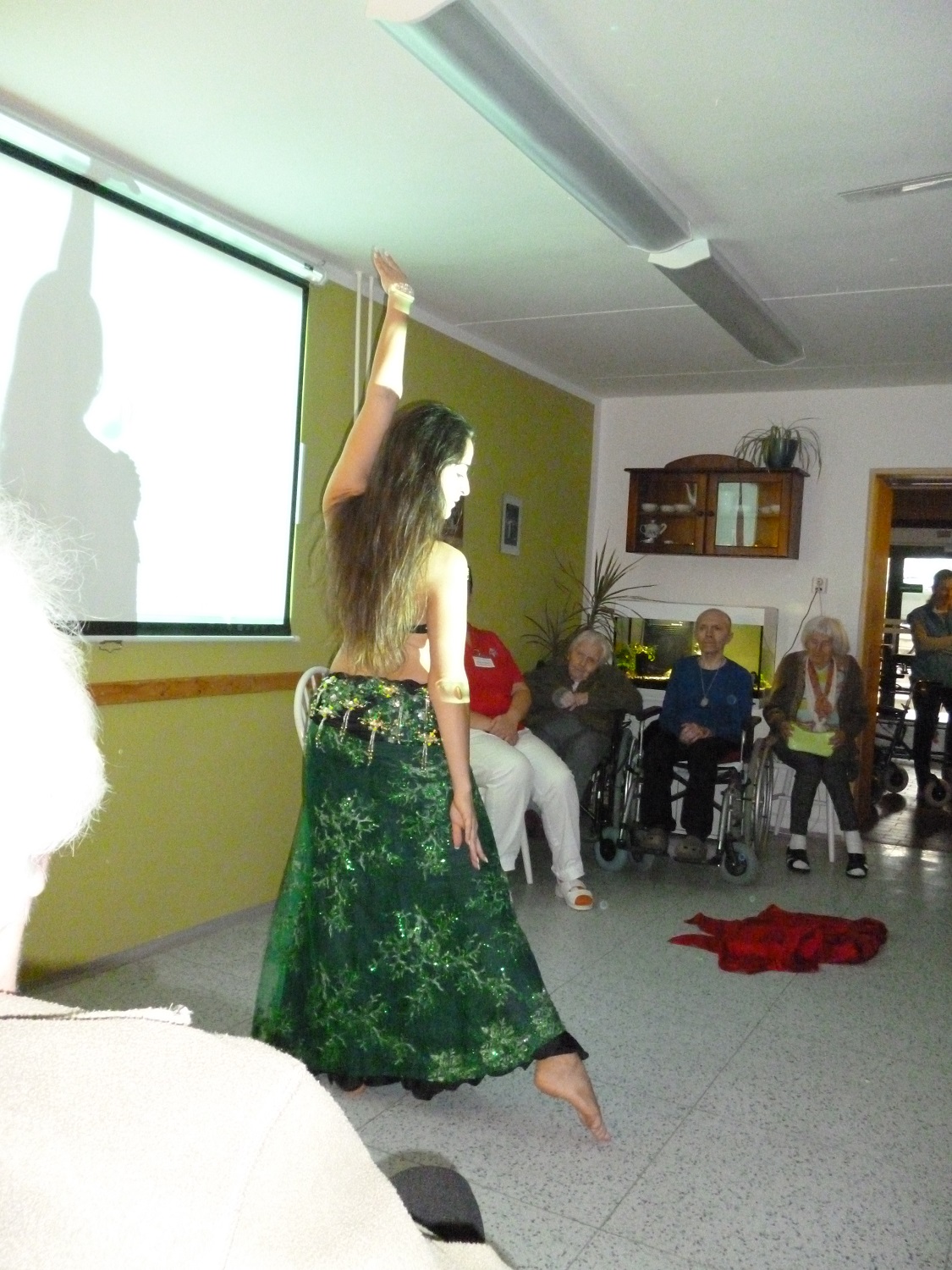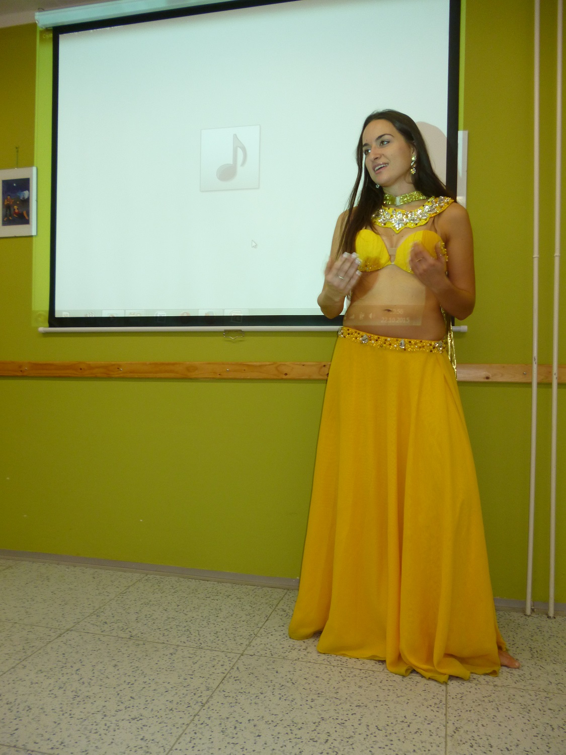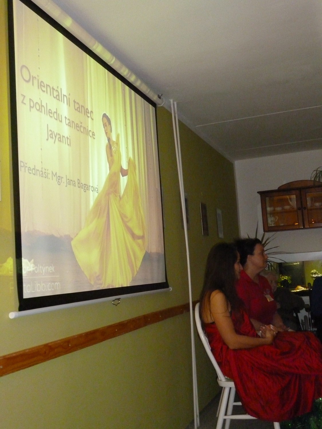 V úvodu přednášky se s námi podělila o svoji životní cestu, která ji k tanci přivedla. Za největší dosavadní vrchol kariéry považuje bronzovou medaili z největší mezinárodní soutěže orientálního tance pořádané v USA. Při sledování prezentace jsme se ocitli na pódiu se špičkovými světovými tanečnicemi, mezi které účastnivší se Jana právem patří. Zapojením naší fantazie jsme se na kouzelném létajícím koberci přenesli do překrásného paláce v dávné Persii, kde pro potěchu sultána tančila jako barevný motýl charismatická tanečnice. Věříme, že ochutnávka orintálního tance nebyla v našem domově poslední...