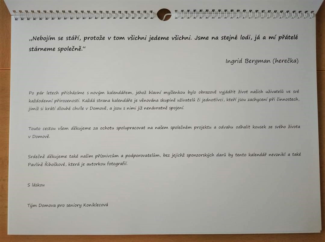 A to jsme se pokusili ukázat v „Nekonečném kalendáři 2022 a dál“. Oslovili jsme fotografku Pavlínu Řihoškovou, která v domově před nějakou dobou pracovala jako sociální pracovnice. Později se vydala na dráhu fotografky a se znalostí prostředí dokázala citlivě zachytit každodenní situace tak, jak jsou. V kalendáři najdete lidi bez líčení, bez vytvořeného účesu, focené bez lamp a stativů. Život našich klientů v realitě všedního dne. Kalendář byl stejně jako ten předchozí zaplacen z darů od sponzorů a zdarma předán jak jeho aktérům, zaměstnancům, příznivcům domova, atd. Prohlédnout si ho můžete ve vestibulech domova. Děkujeme všem, kteří se podíleli na projektu kalendáře. Opět se podařila krásná věc.
