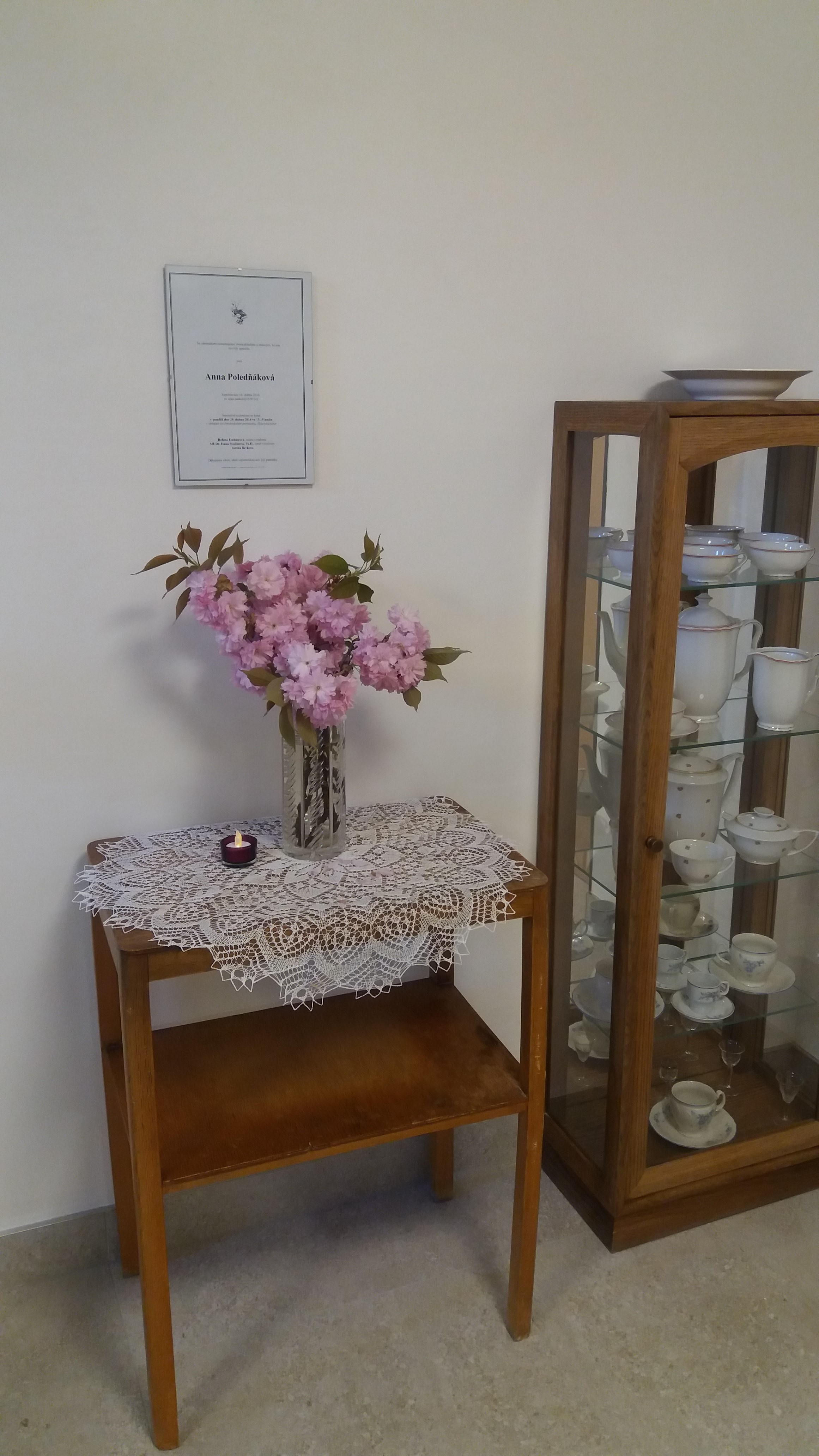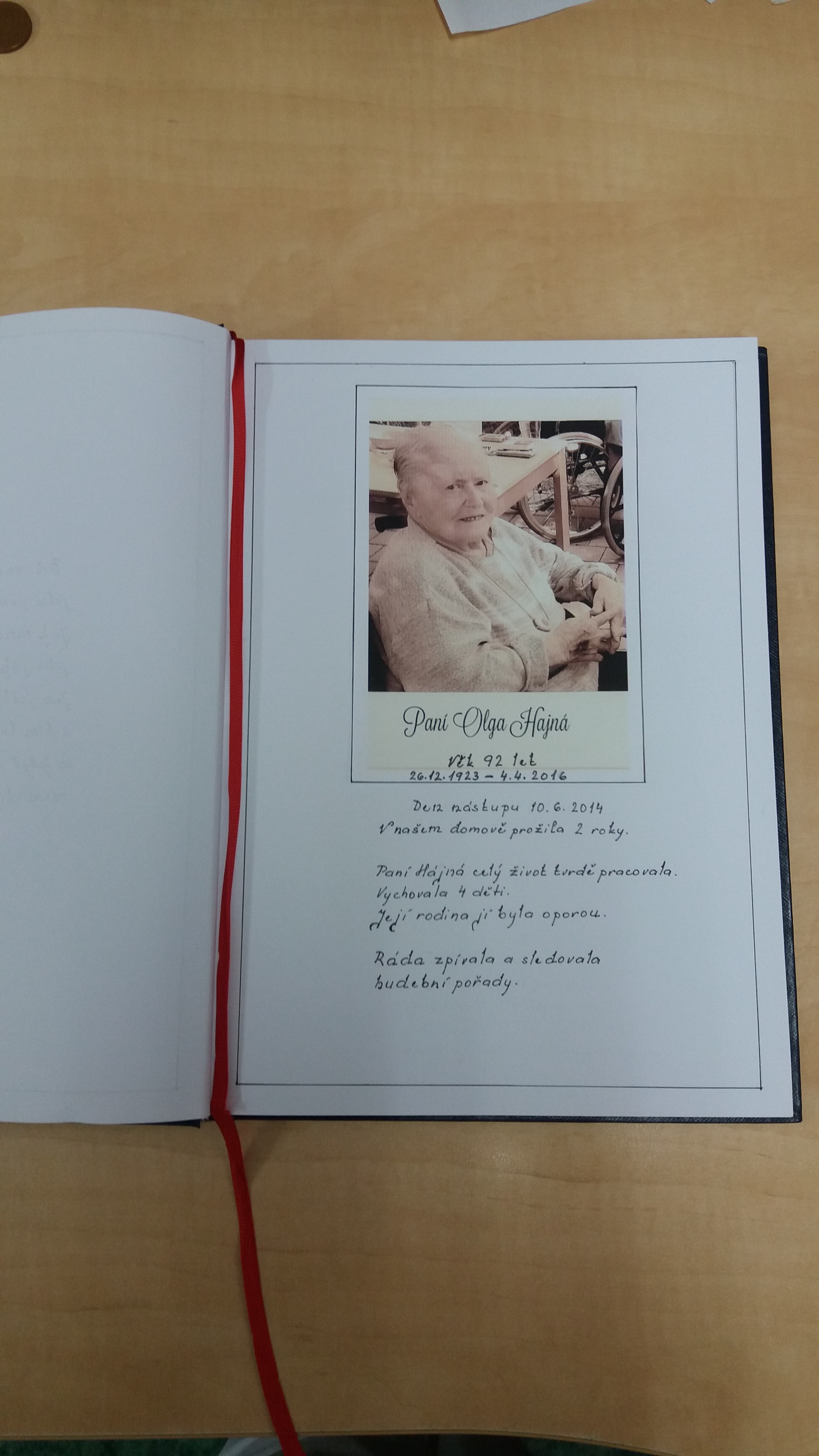 Uživatelé domova pro seniory byli vyzvání formou dotazníku ke spolupráci nad návrhy Pamětní knihy a vhodného, důstojného umístění parte v našem Domově. Dle vyhodnocení dotazníku byla založena Pamětní kniha zesnulých uživatelů a vybráno dle přání uživatelů místo pro parte. Nyní po opravě vestibulu před společenskou místností „Čajenka“ se vytvořilo důstojné místo, které zapadá do příjemného prostředí vestibulu.