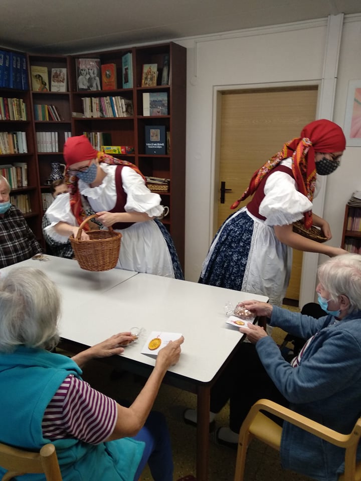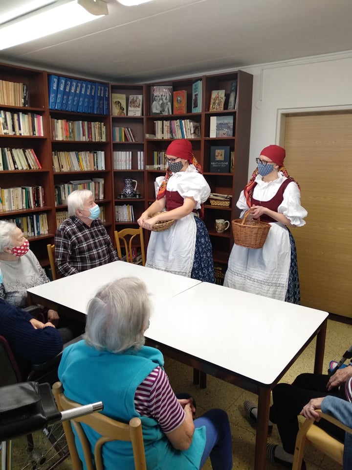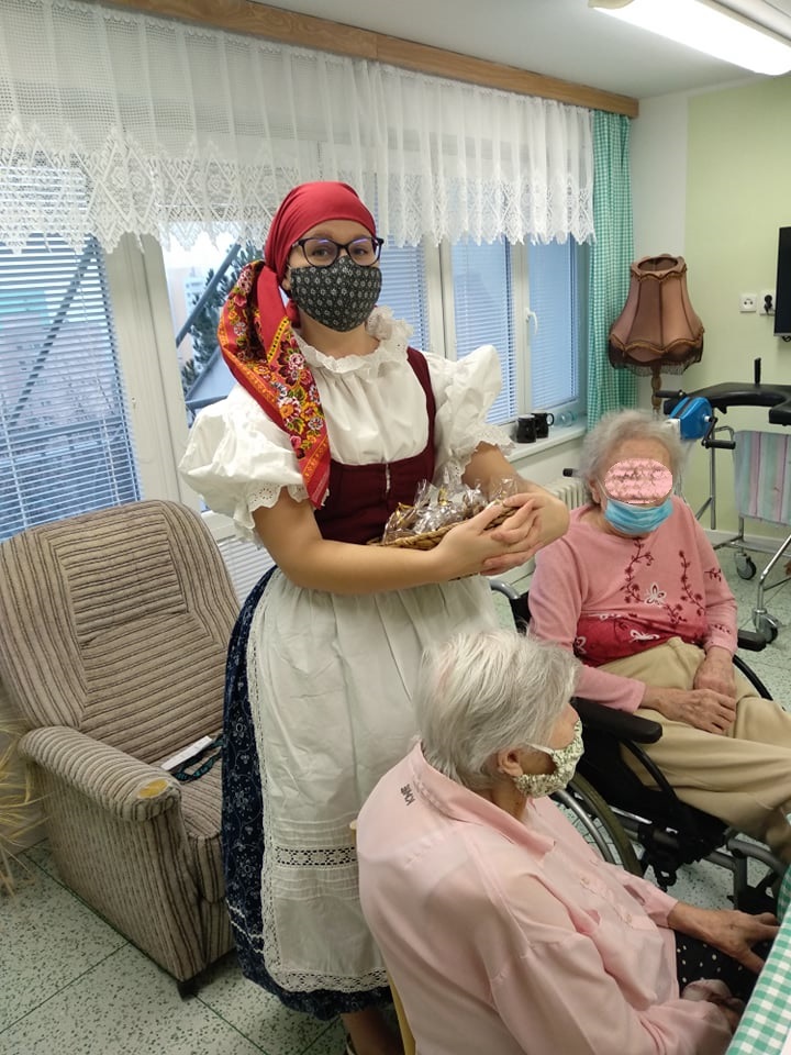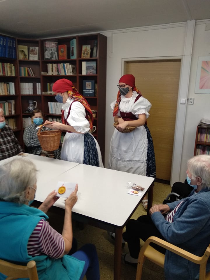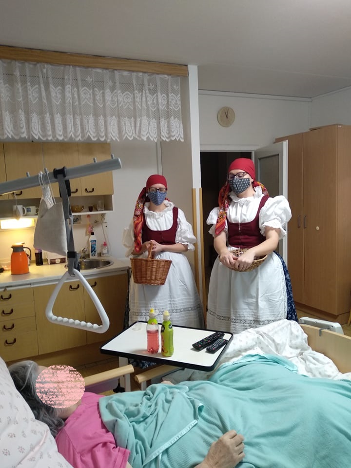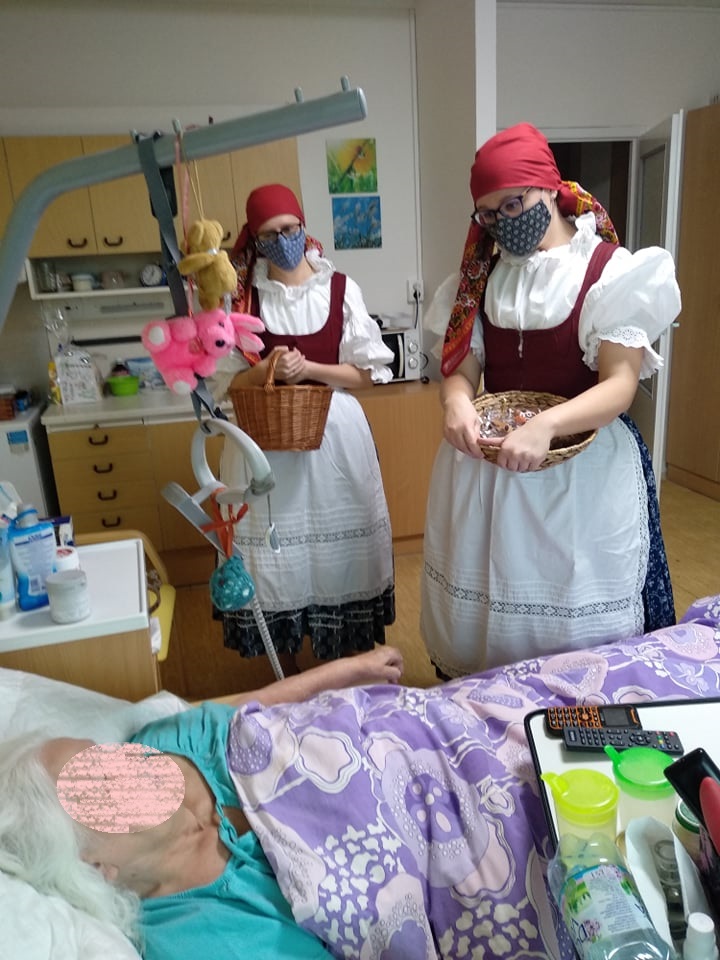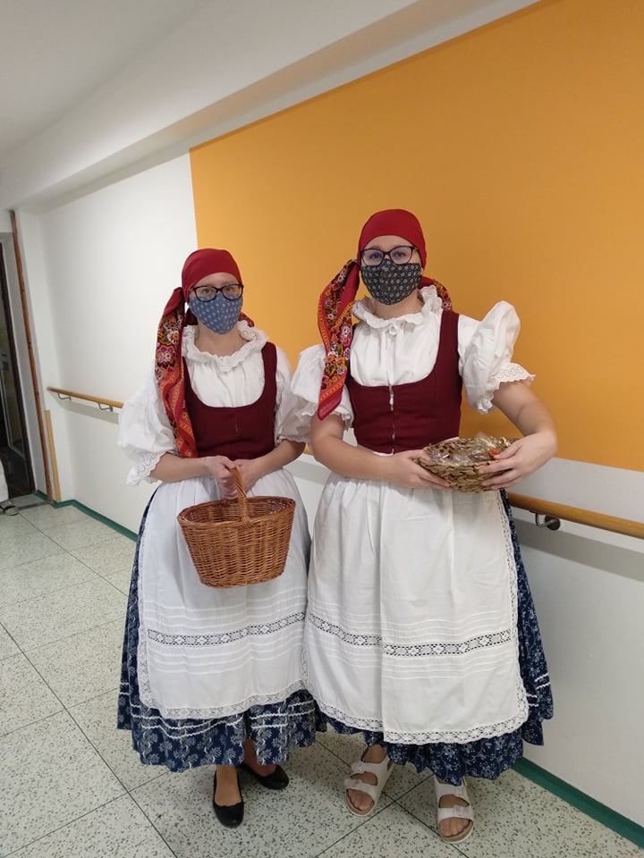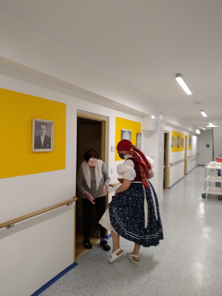 Abychom vynahradili klientům zážitek a vánoční náladu,kterou na adventech zažívali, oblékly se dvě pracovnice do podhoráckých krojů a každému klientovi společně s p.ředitelkou a vrchní sestrou osobně popřály krásné svátky a krojované zazpívaly jeho oblíbenou koledu. V malé skupince potom předvedly ukázku z vánočního koledování, tzv. pastýřské hry. Kroj, koledy i pastýřská hra pochází z městyse Doubravníka. Tímto děkujeme úřadu městyse, který zapůjčil kroje z archivu.