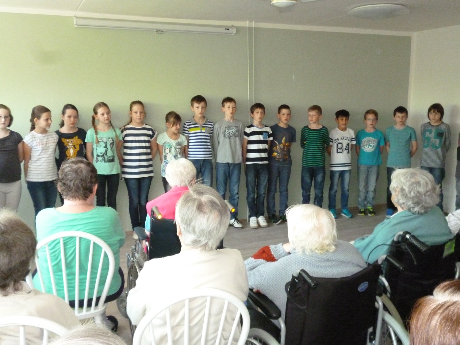 Už několik měsíců spolupracujeme s p. učitelkou Širokou ze Základní školy Kamínky a jejími žáky, kteří chodí za našimi uživateli na návštěvu. Obvykle se po skupinách rozchází za "svými", aby si popovídali, co je nového. Je radost sledovat, jak vznikají mezigenerační přátelství. Jak se děti zajímají o život seniorů a jak se všichni usmívají, když od nich děti odchází.