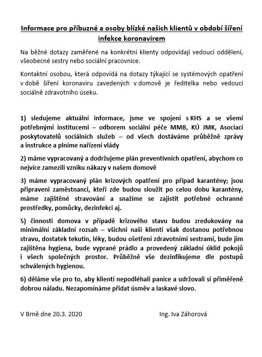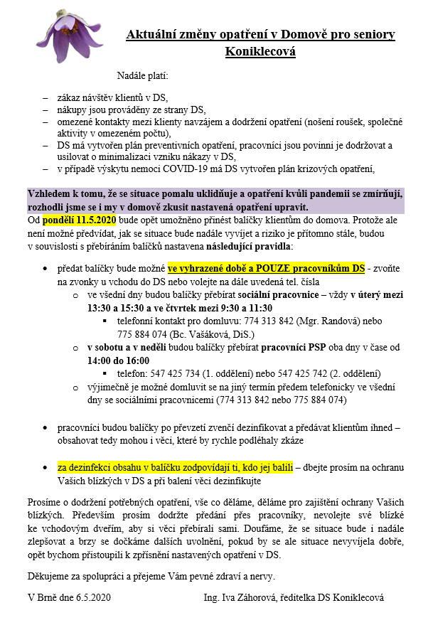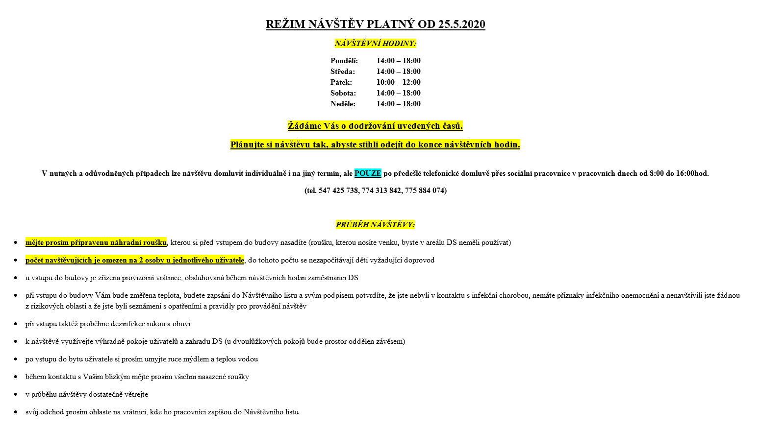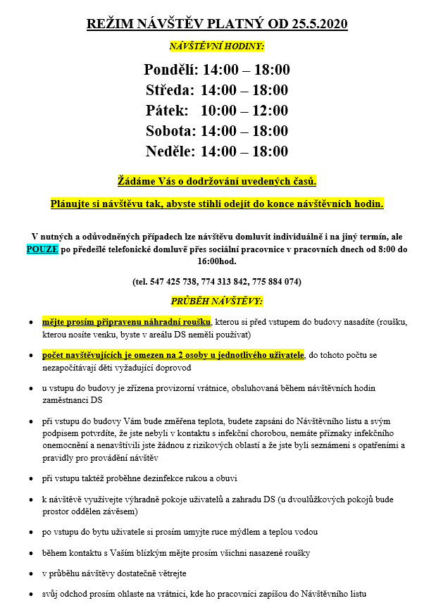 Situace v našem zařízení se opět trochu mění - a tentokráte můžeme po dlouhé době s radostí konstatovat, že snad k lepšímu. Hlavní zprávou je to, že od pondělí 25.5.2020 budou povoleny návštěvy u Vašich blízkých. Vzhledem k tomu, že se ale stále jedná o jednu z nejohroženějších skupin populace, budou tyto návštěvy spojeny s určitými pravidly.