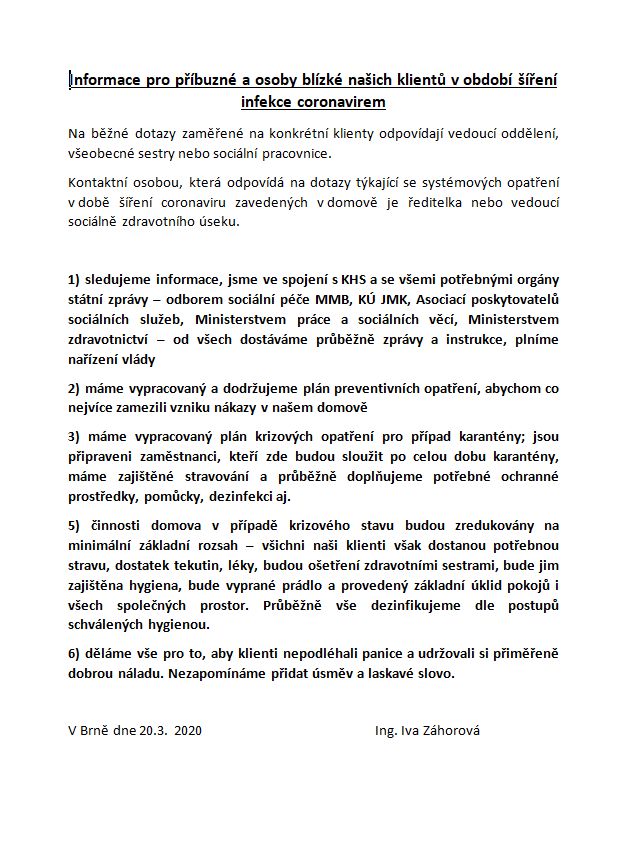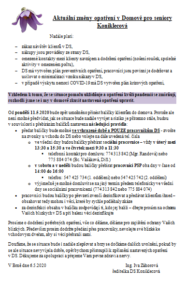 Věříme, že Vás tato zpráva potěší a z možnosti návštěv máte radost stejně jako my a že budete společně s námi i v době rozvolňování dodržovat nastavená pravidla, kterými se snažíme co nejvíce ochránit Vaše blízké a naše klienty