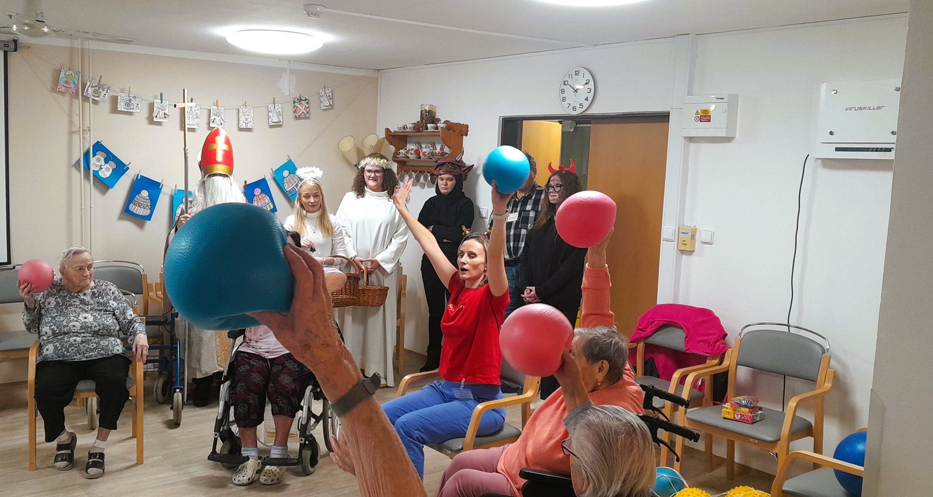 Nejprve Mikuláš a jeho doprovod navštívili uživatele, kteří v té době cvičili na židlích. Společně si zazpívali, uživatelé jim ukázali jak cvičí a došlo k rozdávání dárku.