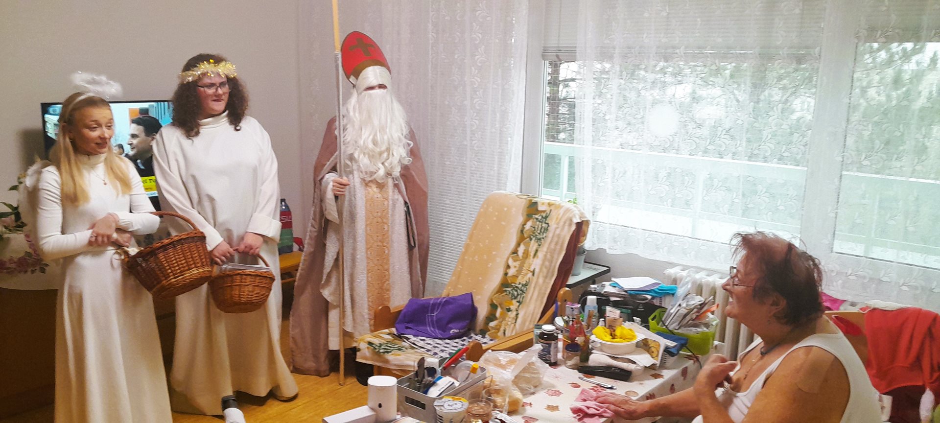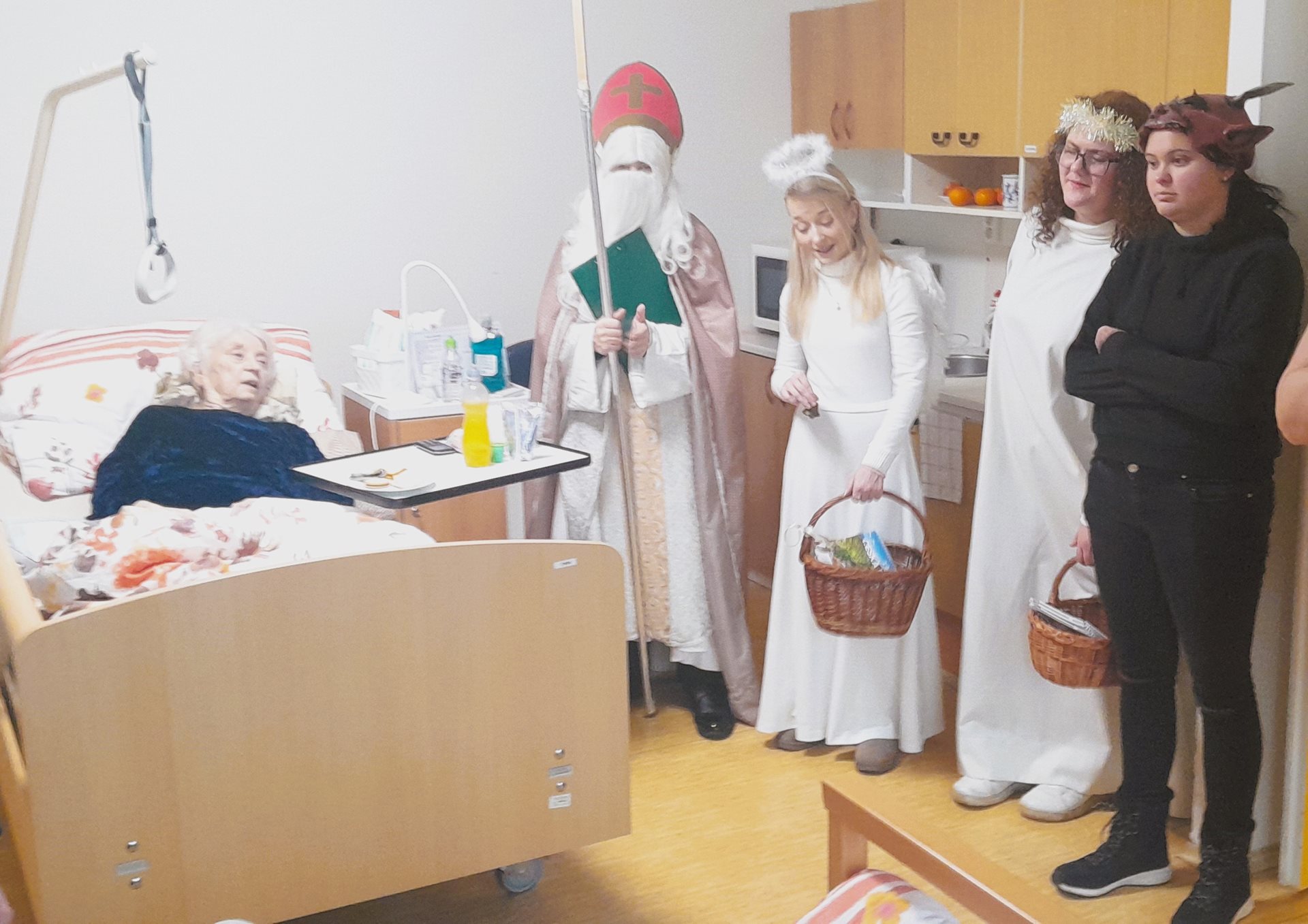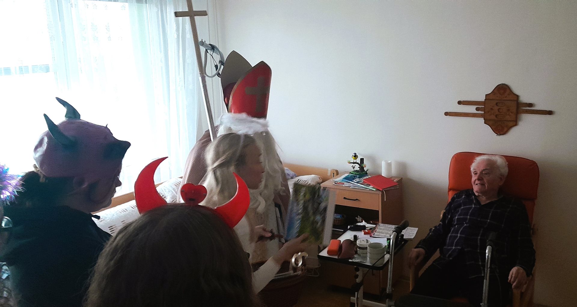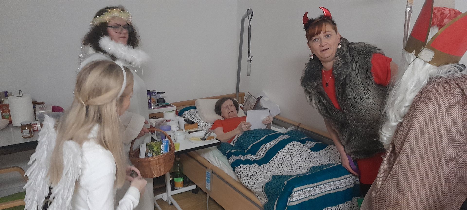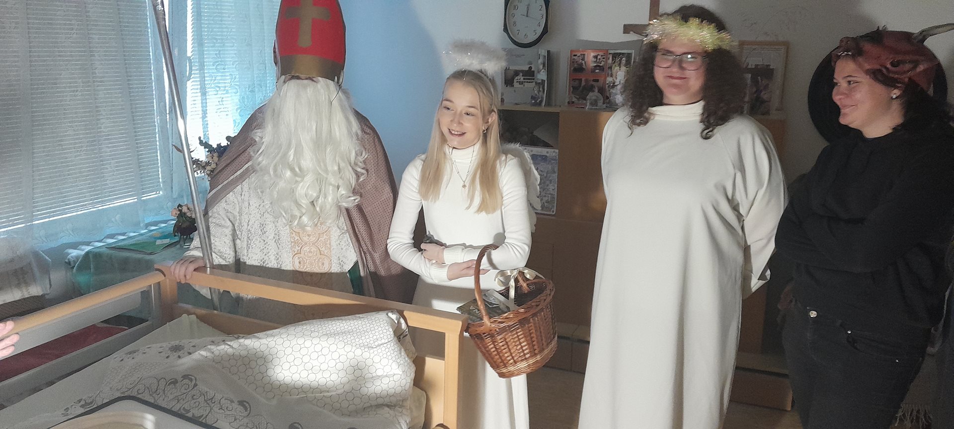 Je pátek 5. prosince 2026 a k nám do Domova přichází Mikuláš, andělé a dva čertíci. Mají jediný úkol - navštívit naše uživatele, udělat jim radost a předat dárek. A věřte, že to bylo krásné prožití dopoledne.