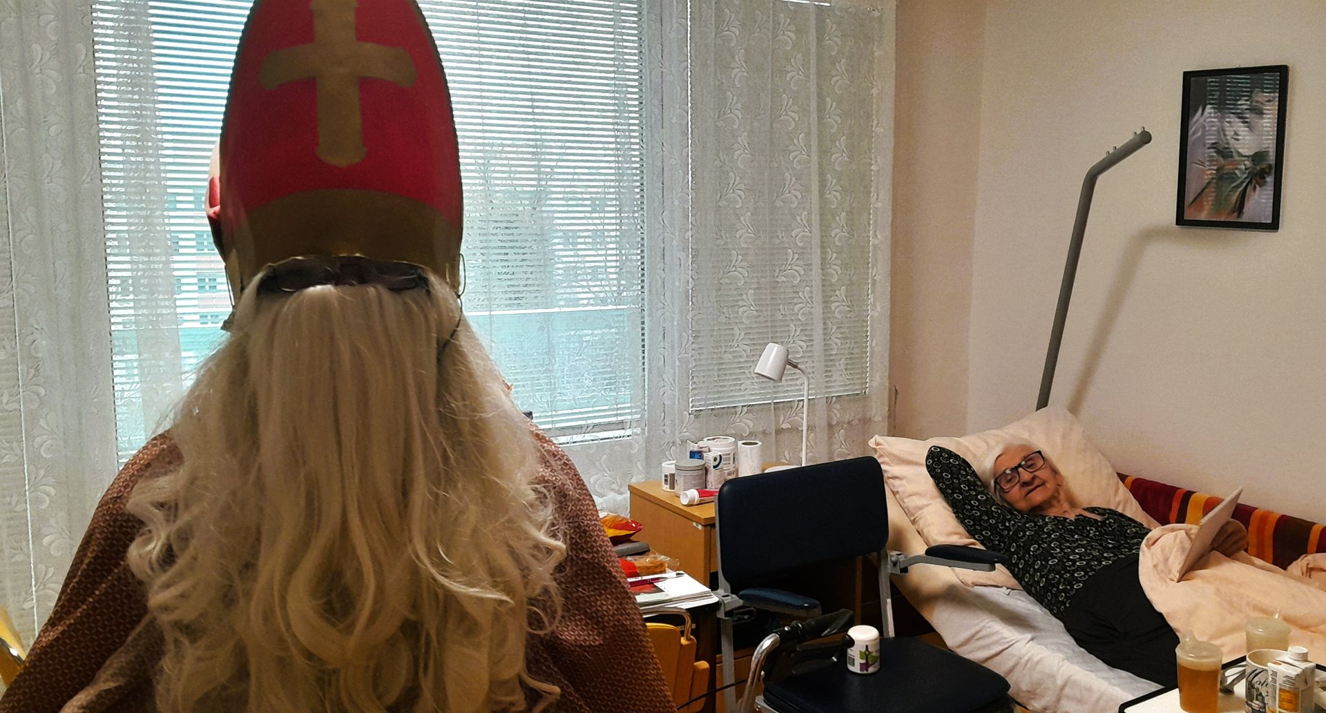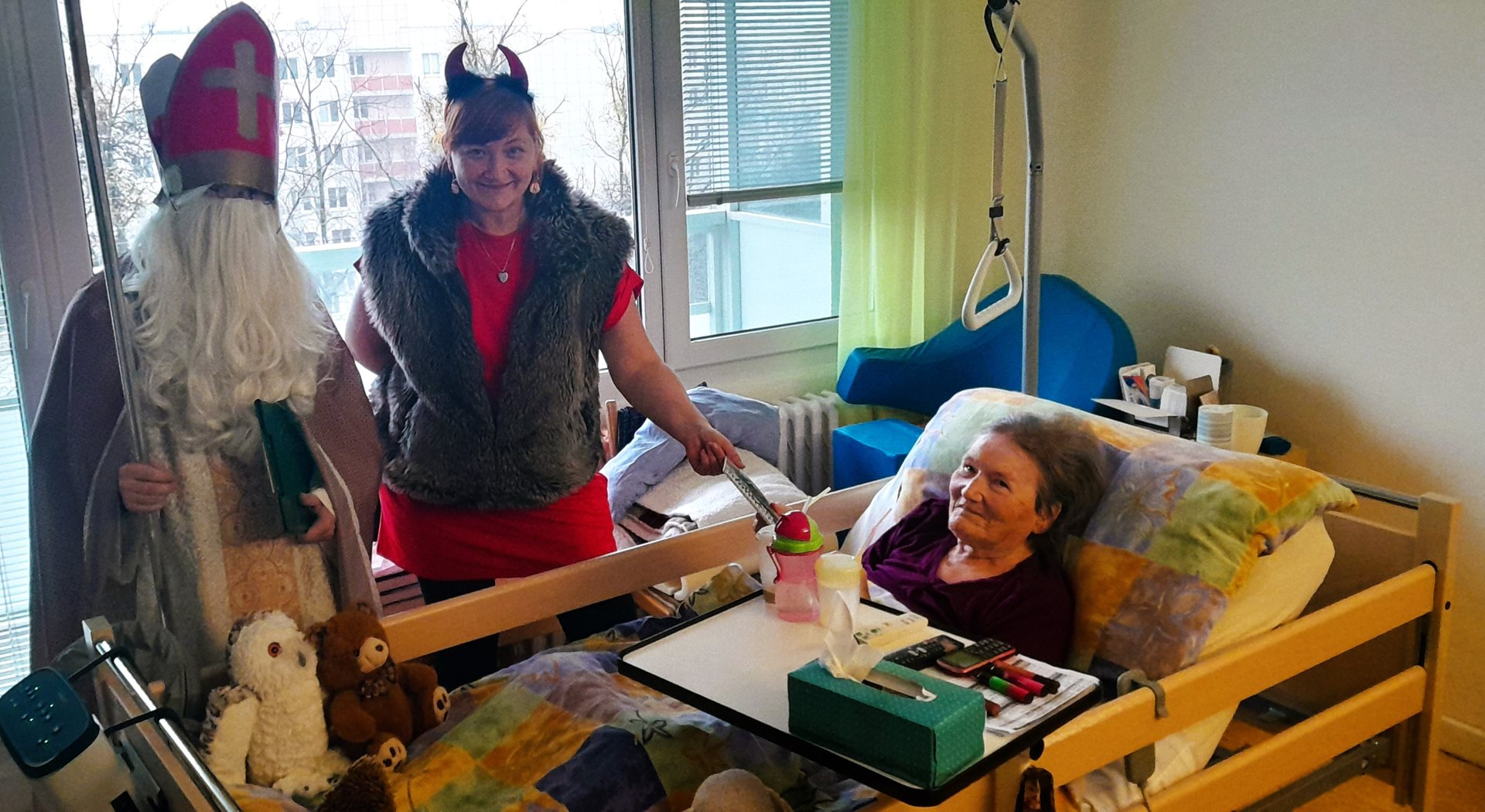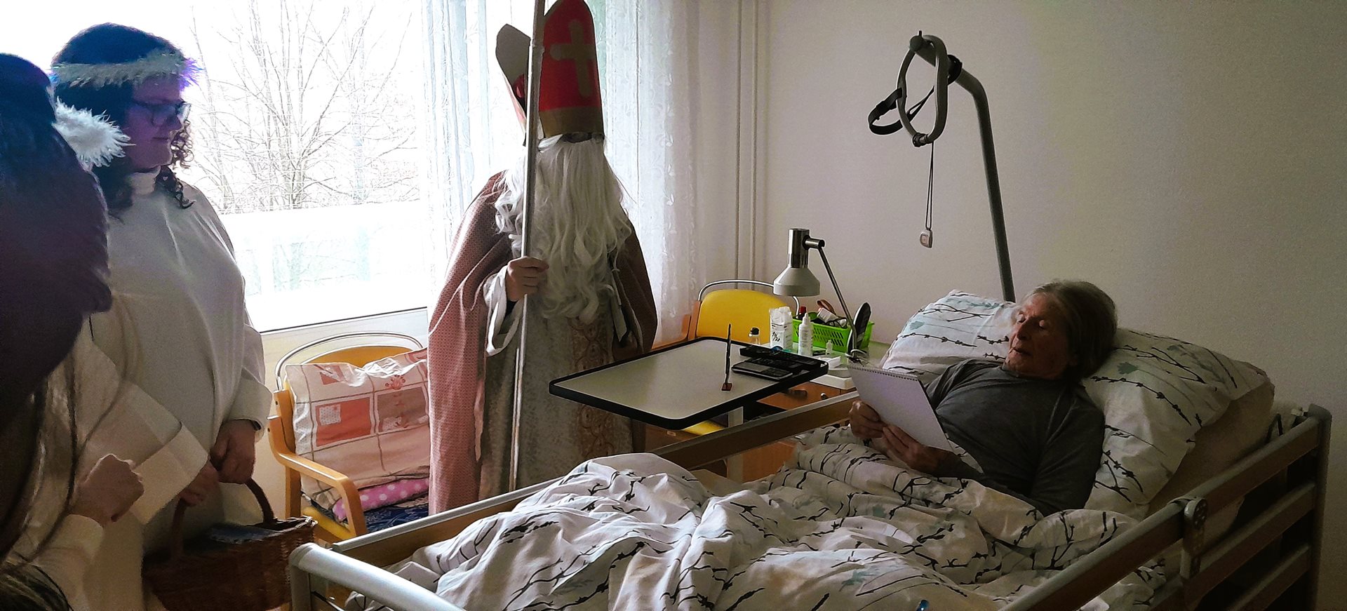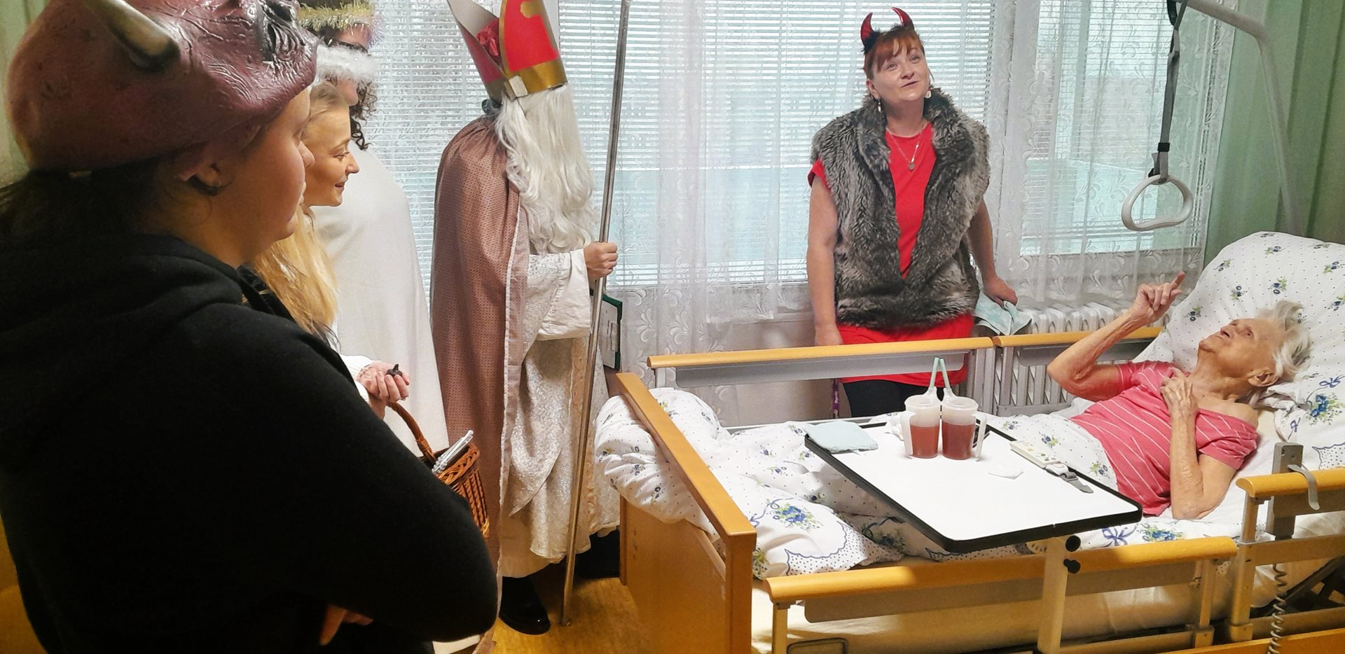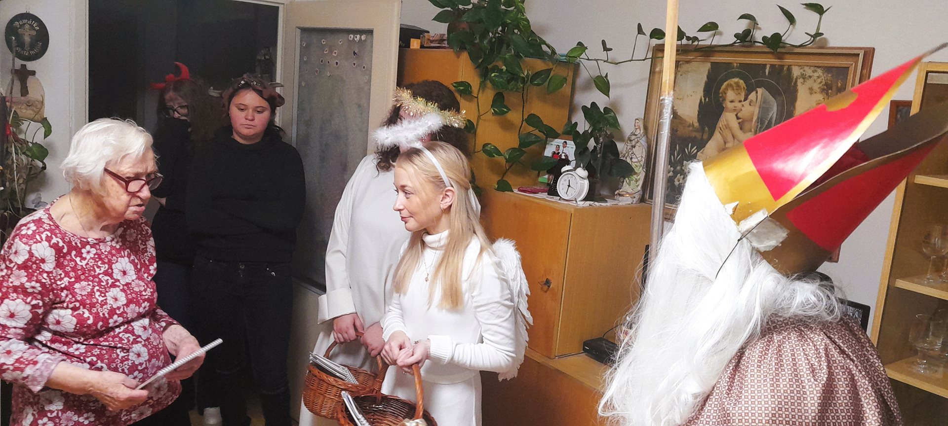 Je pátek 5. prosince 2026 a k nám do Domova přichází Mikuláš, andělé a dva čertíci. Mají jediný úkol - navštívit naše uživatele, udělat jim radost a předat dárek. A věřte, že to bylo krásné prožití dopoledne.