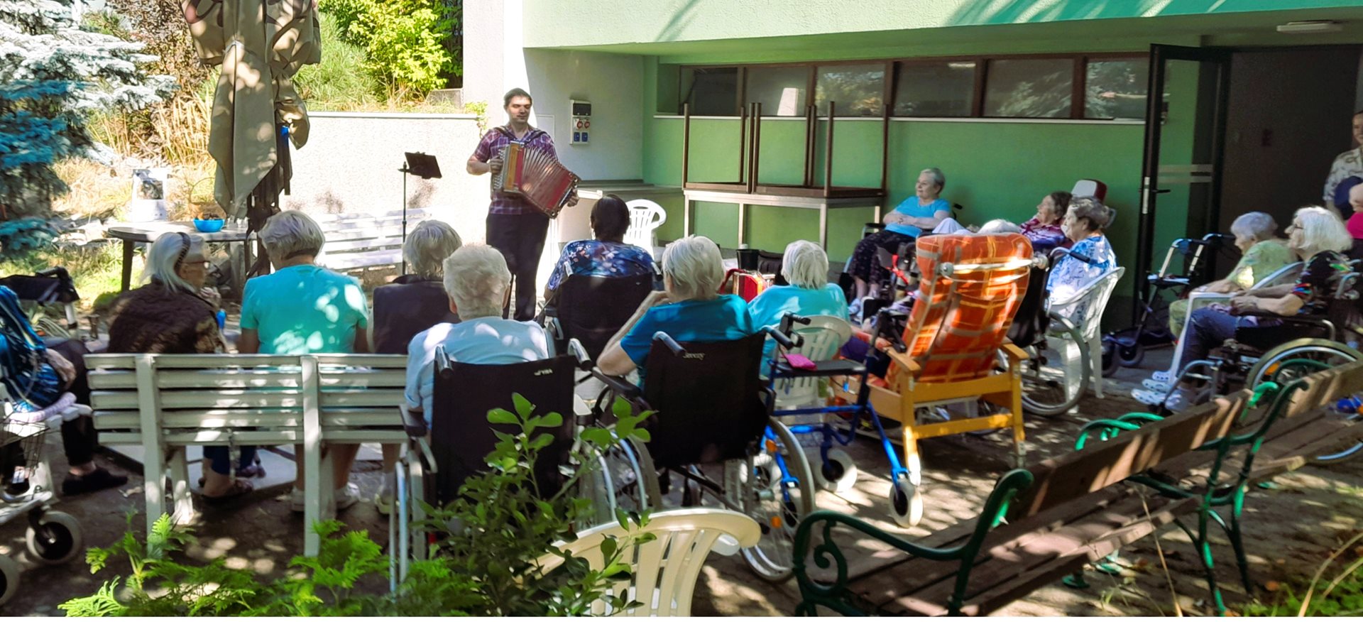 Ve středu 20.8.2025 nás navštívil harmonikář pan Jan Hažmuka. Strávili jsme velmi příjemně dopoledne. Klasická harmonika se střídala s heligonkou. Poslouchali jsme krásné tóny a taky si společně s harmonikářem zazpívali.